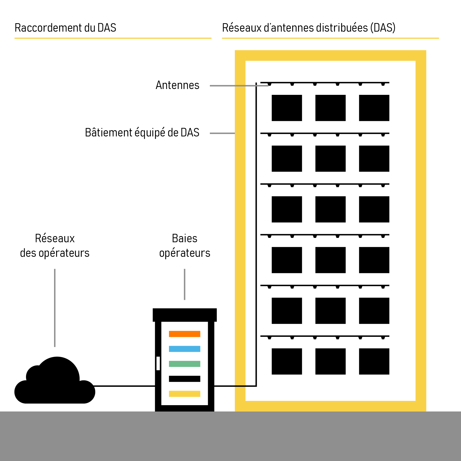 Con el DAS también es posible agrupar una antena entre varios operadores en un mismo edificio de oficinas. ¿Resultado? Menos antenas, menos infraestructuras, ¡pero muchos operadores! Sin olvidar una instalación muy discreta – encastrada en el falso techo, por ejemplo. En caso de agrupación, los equipos denominados «fuentes comunes» están, por su parte, conectados a la antena agrupada mediante una red de fibra óptica. Todos los equipamientos se instalan en un local técnico situado en el interior del edificio o a varios kilómetros en las instalaciones de alojamiento centralizadas (Data Center).